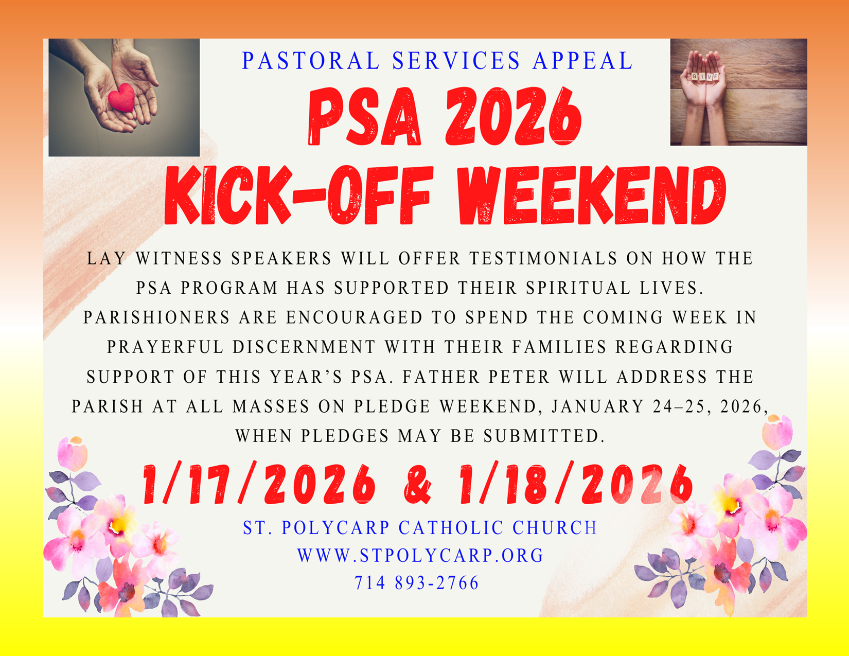 The 2026 PSA Kick-Off Weekend is taking place on January 17–18, 2026. We invite you to come and listen to our lay witness speakers as they share personal testimonies on how the PSA program has helped them and their families grow spiritually. Following the Kick-Off Weekend, you will have the entire week to pray and discern with your family before returning the following weekend, January 24–25, 2026, when you may submit your 2026 PSA pledges. Thank you for your continued prayerful support of our 2026 PSA campaign. If you have any questions, please feel free to stop by the parish office.